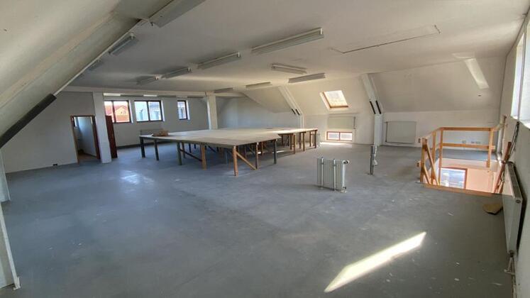 Unten Büro. Über eine breite Treppe in den großen Raum. Oben Toilette mit Gastherme.