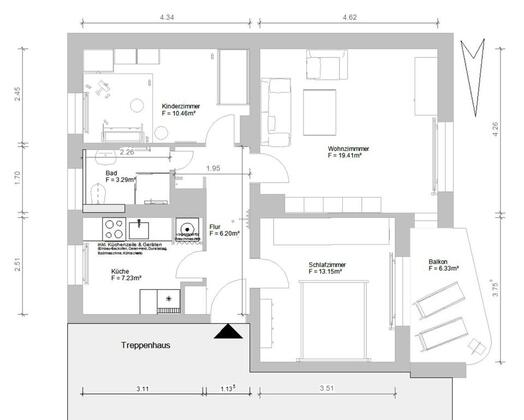 62,84 m² · Balkon zum Innenhof · neue Einbauküche · modernes Duschbad mit Fenster